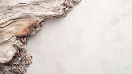 Modern white backdrop with light brown grainy bark details layered subtly at the edges, clean and warm design