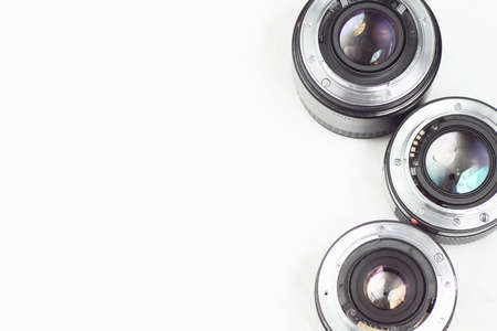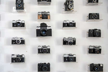 Ukraine, Kiev, 5 August 2020. Collection of vintage cameras and camera lens well organized, top view. Group old cameras. On white background
