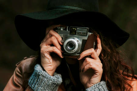 Person with camera in autumn. Woman photographer take a photo of the beautiful autumn nature. photography school