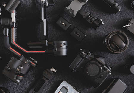 top view of work space photographer with digital camera, Gimbal Stabilizers and camera accessory
