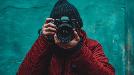 A photographer dressed in red jacket and black beanie, holding a professional camera, standing against a teal-colored wall, capturing a dynamic street shot.