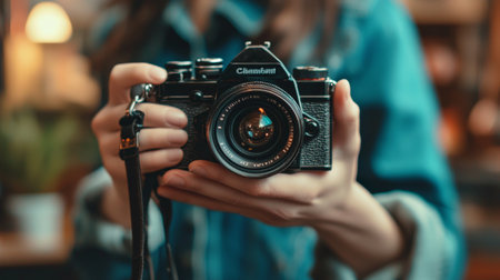 A detailed close-up shot of hands holding a vintage camera, with a softly blurred background creating a nostalgic and artistic feel.