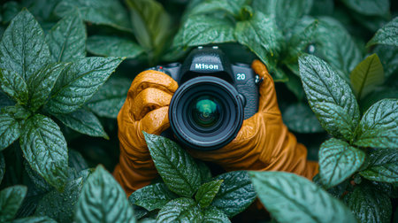 A close-up shot of a photographer's hands holding a camera, surrounded by lush green leaves in natural light.