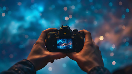Photographer taking photo with DSLR camera in his hand. Night sky background