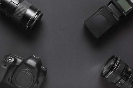 Photo equipment frame. Top view of diverse personal equipment for photographer, copy space
