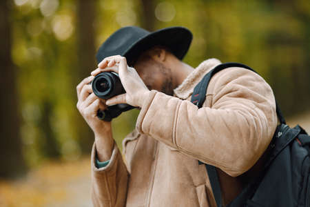 Photographer hipster man Hiking and tramping. Travel and adventure concept. Handsome guy taking photo on camera, in nature, outdoors. copy space. portrait
