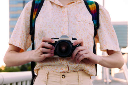 close-up of the hands with a camera of photos of an unrecognizable young tourist woman, concept of youth and traveler lifestyle