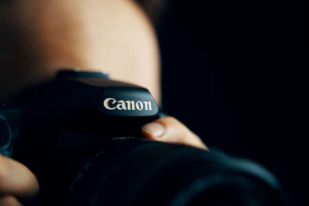 Man takes pictures on a Canon camera and tries to focus the lens and takes pictures. Photo editor, cameraman, journalist. Bishkek, Kyrgyzstan - December 15, 2019.