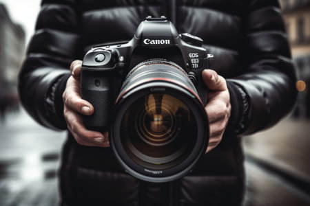 Digital single lens reflex camera in male hands. Photographer shooting hands close up. Man photographer makes photos. Male hands hold the camera close-up