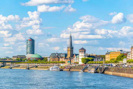 DUSSELDORF, GERMANY, AUGUST 10, 2018: Riverside of Rhein in Dusseldorf with Saint Lambertus church, Germany