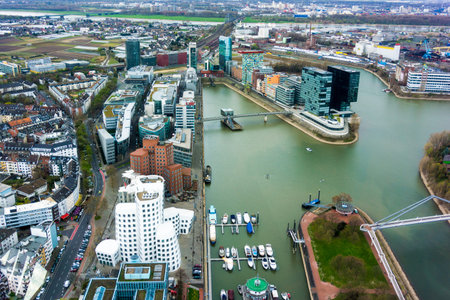 Aerial view Dusseldorf during morning. Media harbor Dusseldorf