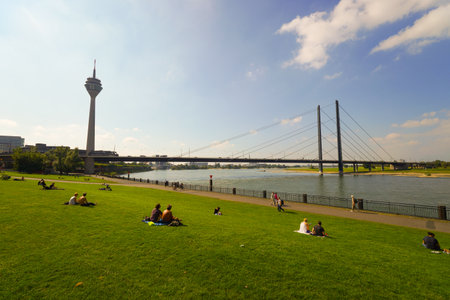 People enjoy sunny weather and hang out by Rhine (Rhein) river in Dusselforf. Rhine Tower (Rheinturm) is in the background.