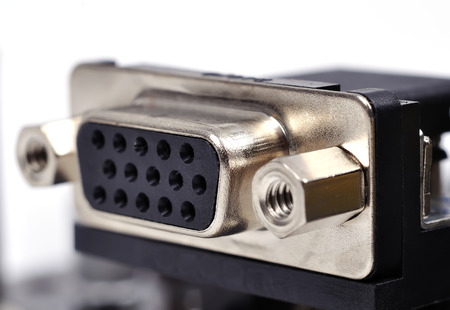 Simple laptop computer VGA video output connector, monitor connection port object macro, detail extreme closeup, frontal shot, nobody. Old legacy video outputs, obsolete dated retro technology concept