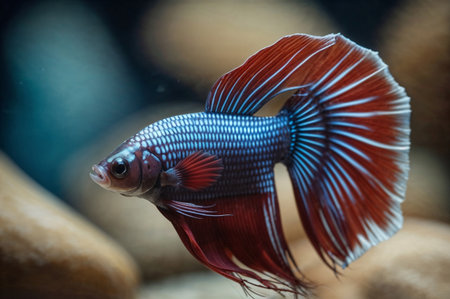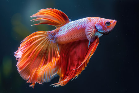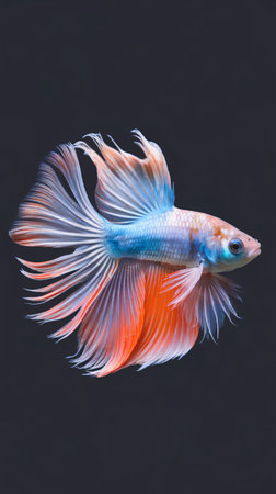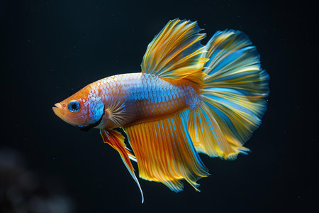 A vibrant betta fish with flowing fins, showcasing stunning blue and orange colors against a dark background.