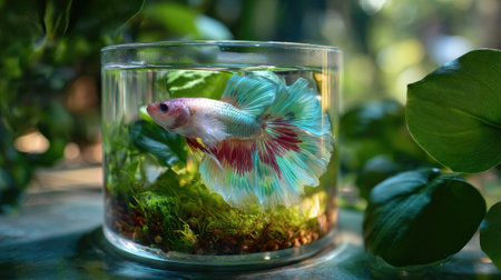 A stunning betta fish swims gracefully in a glass bowl, surrounded by lush greenery, creating a serene aquatic habitat filled with vibrant colors.