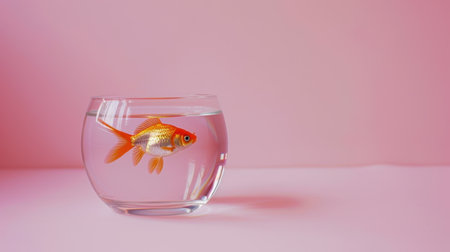 A solitary goldfish glides gracefully in a clear glass, placed on a damp surface, surrounded by a misty atmosphere.