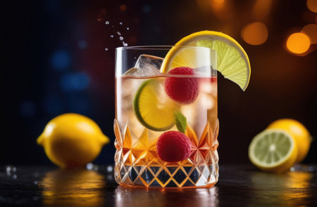 summer cocktail with lemon and berries, alcoholic cocktail, soft drink with ice, International Bartenders Day, dark background