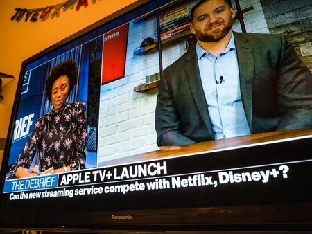 Paris, France - Nov 1, 2019: Man holding remote watching latest news with Apple TV plus launch - streaming movie service by Apple Computers compete with Netflix, Disney Plus