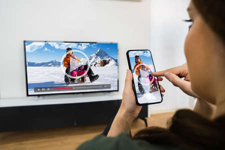 Asian hands, using mobile phone, connected to monitor or TV,To watch movies Direc TV, on vacation, after work, inside the house. Bangkok, Thailand 19 August 2021.