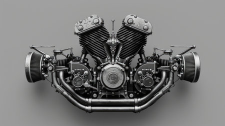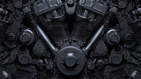 Detailed close-up of a Harley Davidson engine with sleek steel elements and a seamless pattern, highlighting mechanical complexity and industrial aesthetics.