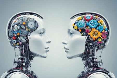 Futuristic Robots Facing Each Other with Exposed Mechanisms. Generative AI.