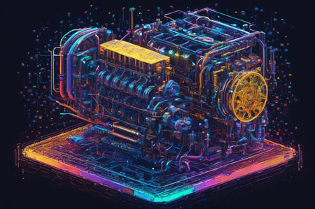 Intricate and futuristic engine design showcasing detailed components illuminated by vibrant neon glow. A 3D visualization highlighting mechanical precision and innovative aesthetics.