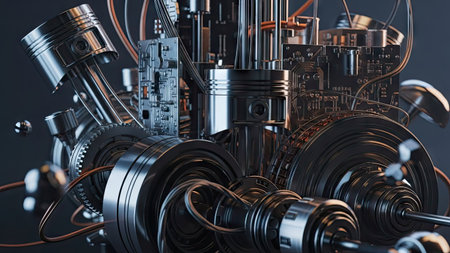 Explore the intricate details of metallic machine components, highlighting precision engineering in a modern industrial environment. Ideal for technology and manufacturing themes.