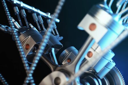 3d illustration of an internal combustion engine. Engine parts, crankshaft, pistons, fuel supply system. V6 engine pistons with crankshaft in motion. Illustration of car engine inside.