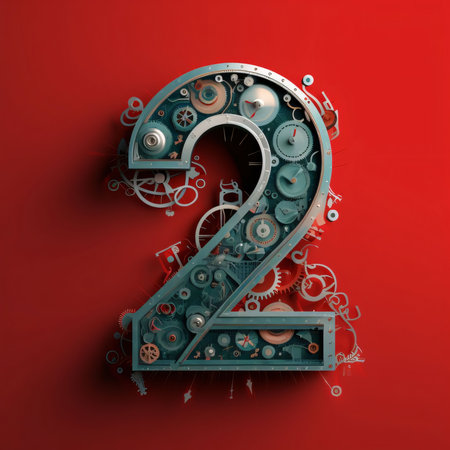 Graphic numbers: Mechanical number 2 made of gears and cogwheels on red background