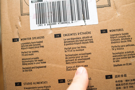 Paris, France - Apr 18, 2023: A close-up shot of the text details on the Klipsch R-40M speaker box, highlighting its multilingual description of product features hand reading