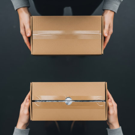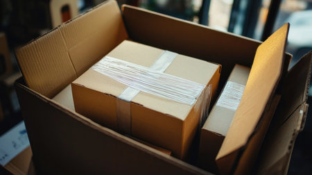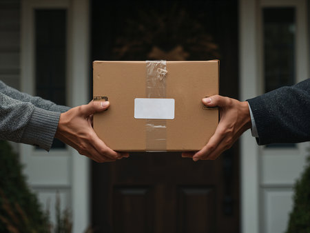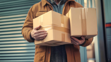 Two individuals are depicted interacting with cardboard packages. The image displays a delivery, focusing on the exchange of parcels. Warm lighting bathes the scene, highlighting the textures of the packages and the hands involved. This photograph is appropriate for illustrating logistics and e-commerce concepts.