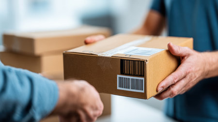Two people are shown exchanging a cardboard box indoors. The box is brown with a label. The hands are prominent in the composition. The lighting appears natural and bright. This image could be used for illustrating e-commerce, logistics, or delivery services in advertising and editorial contexts.
