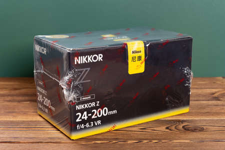 ZHONGSHAN GUANGDONG China-October 6 2020:wrapped box of a Nikon camera lens of Z mount Nikkor Z 24-200MM f4-6.3 vr.