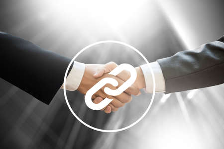 Conceptual silhouette of hands joining with steel chain at sunset, symbolizing connection. Silhouette of hands connecting with steel chain at sunset