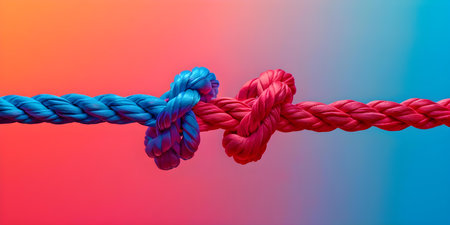 A close-up photograph of a red and blue rope tied together in a knot, symbolizing unity and strength.
