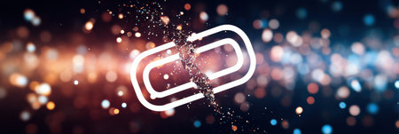 A bright cyan chain link icon, rendered with geometric lines and glowing effects, with streaks of light trailing behind it on a dark reflective surface. Clear details and vibrant colors enhance vis...