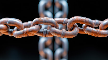 Weathered chain links display intricate textures and rust, highlighting their industrial use and age.
