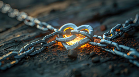 This captivating image features heart-shaped chain links glowing with warm light, symbolizing love and connection. The intricate details highlight emotion and beauty.
