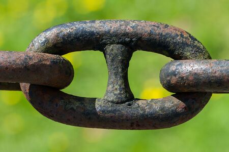 A close-up of a chain link, showing a black and rusty surface, symbolizing strength and the passage of time.