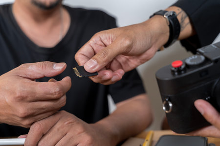 Close-up of two people exchanging SD memory card, one handing and one receiving, with camera nearby. Concept of data transfer, backup, photography workflow, or collaboration between photographers.