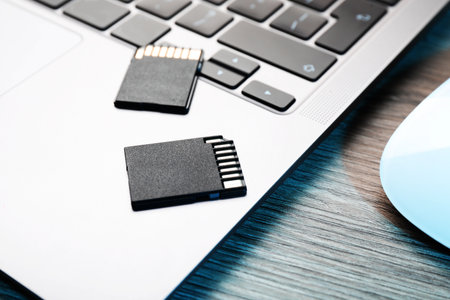 Memory cards arranged on a laptop surface