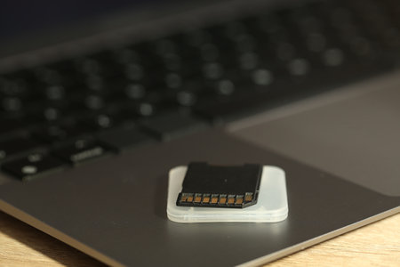 SD memory card and holder on laptop, closeup