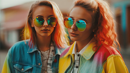 Two women with colorful hair in silhouette, standing back to back against a vibrant backdrop, exuding creativity and individuality.