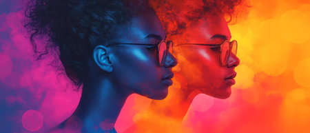 Side profiles of women in blue and orange lighting, abstract representation of diversity. Concept of inclusion and individuality.
