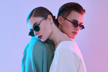 Couple poses back to back with vivid red and blue lighting highlighting their expressions. Modern studio atmosphere with creative lighting. Concept for fashion, portrait photography, creative arts.