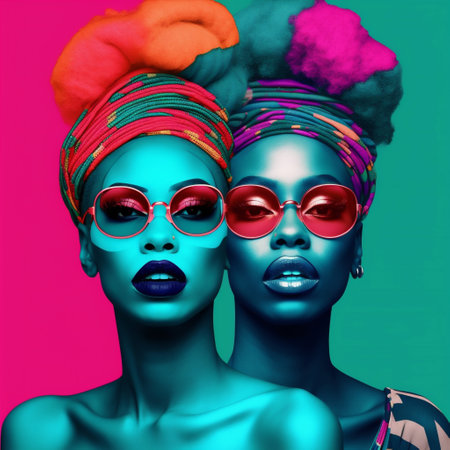 Two women standing in front of a colorful wall with their faces reflected, AI