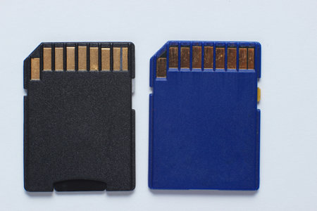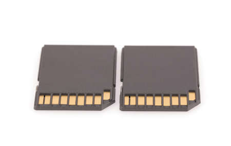 Two isolated plastic blue and black compact memory card (SD card - Secure Digital card) Used in cameras, computers and video cameras in a blue color with metal connectors in the golden color