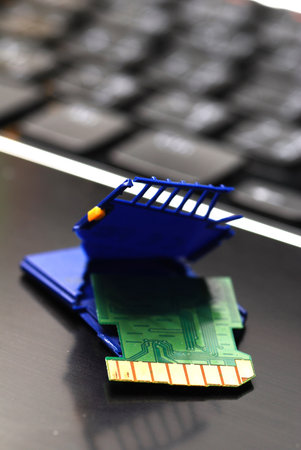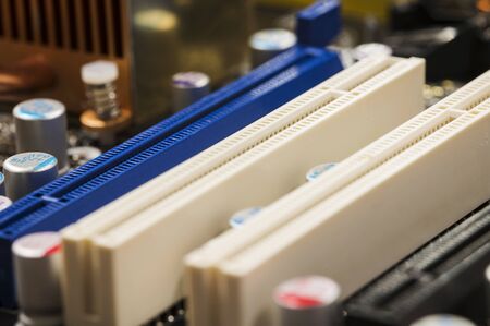 Macro Close up of computer RAM chip; random access memory chip slot for PC motherboard