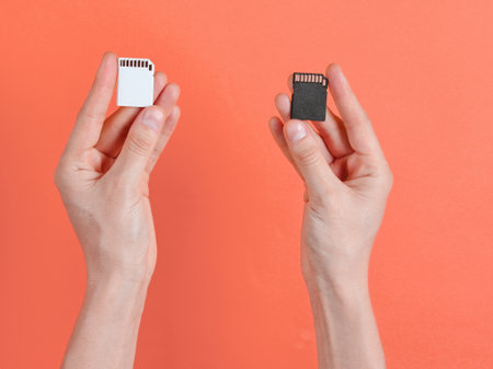 Female hands holds two SD memory cards on orange background. Minimalist Techno Concept. Top view