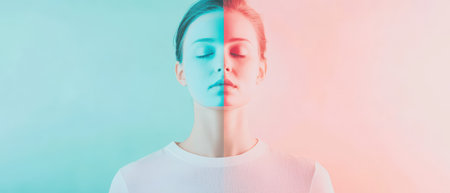 A woman stands with eyes closed half her face illuminated in cool blue and the other half in warm pink creating an artistic contrast.